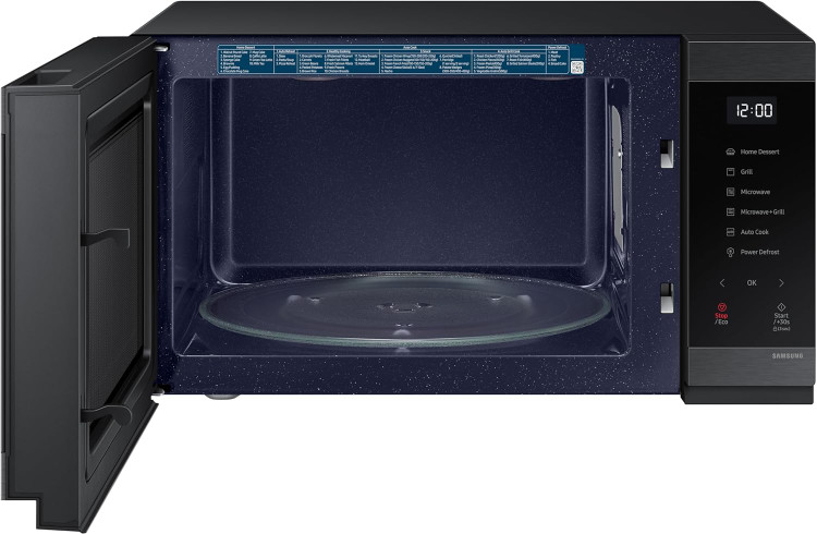 مزییت های مایکروویو ۵۵۲۵ سامسونگ بدنه ضد زنگ آن است که به این راحتی ها خراب نمیشود و طول عمر بسیار بالایی دارد. بدنه مایکروویو به رنگ مشکی است و در جلوی آن یک پنل با دکمه های لمسی قرار دارد که کار را برای شما راحت کرده است و با لمس دکمه ها میتوانید به راحتی تنظیمات مورد نظر خود را انجام دهید. این دستگاه به ساعت نیز مجهز است تا زمان را در مقابل خود در آشپزخانه داشته باشید. زمان پخت را از طریق پنل تنظیم کنید و به دلخواه بسته به نوع غذا آن را اضافه کنید. قدرت مایکروویو سامسونگ ۴۰ لیتری در حدود ۱۵۰۰ وات است که قدرت بسیار خوبی را برای طبخ غذا ایجاد میکند.این دستگاه به قفل کودک مجهز است تا در زمان کار از دسترس کودک دلبندتان دور باشد.درب مایکروویو از راست به چپ باز میشود و یک دستگیره در قسمت زیر درب دارد که به صورت مخفی و دور از دید قرار دارد. جنس بدنه داخلی از لعاب سرامیک است که بالاترین کیفیت را دارد و به راحتی نیز قابل تمیز کردن است. نمایشگر LED تعبیه شده بر روی پنل مایکروویو تمامی تنظیمات دستگاه را مانند برنامه پخت، زمان و… را نشان میدهد. این محصول ارزشمند به گریل نیز مجهز است.